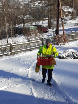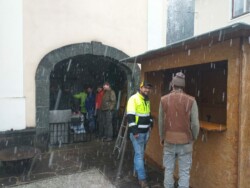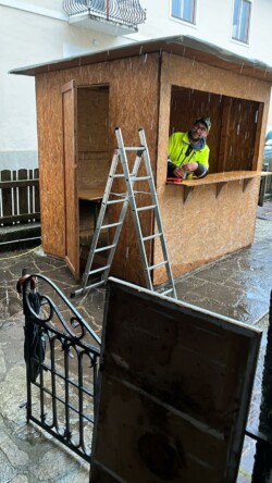 Der Aufbau fand noch im (leichten) Regen statt und da wir sehr viele Helfer waren, ging alles flott von der Hand. Lediglich bei der Fahrt zum Abholen des Standls gab’s einen kleinen Vorfall, bei dem der Lastzug vom Daniel zusammen mit 3 “Passagieren” fast in der reißenden Lieser verschwunden wäre. Als wir (bis auf die Elektrik) fertig waren, ging der Regen in Schneefall über – ein perfektes Timing.